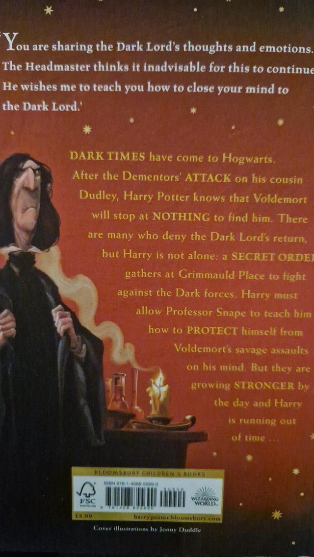 After the Dementors’ attack on his cousin Dudley, Harry Potter knows that Voldemort will stop at nothing to find him. There are many who deny the Dark Lord’s return, but Harry is not alone: a secret order gathers at Grimmauld Place to fight against the Dark forces. Harry must allow Professor Snape to teach him how to protect himself from Voldemort’s savage assaults on his mind.
